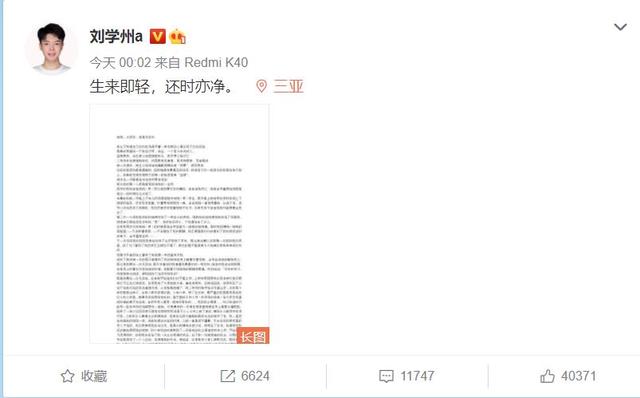 1月24日凌晨,刘学州定位三亚发布“生来即轻,还时亦净”的告别文章。