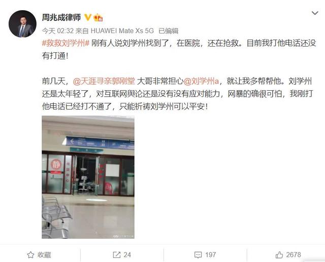 凌晨两点多,代理过多个知名案件的周兆成律师发文表示:前几天,郭刚堂大哥非常担心刘学州,就让我多帮帮他。