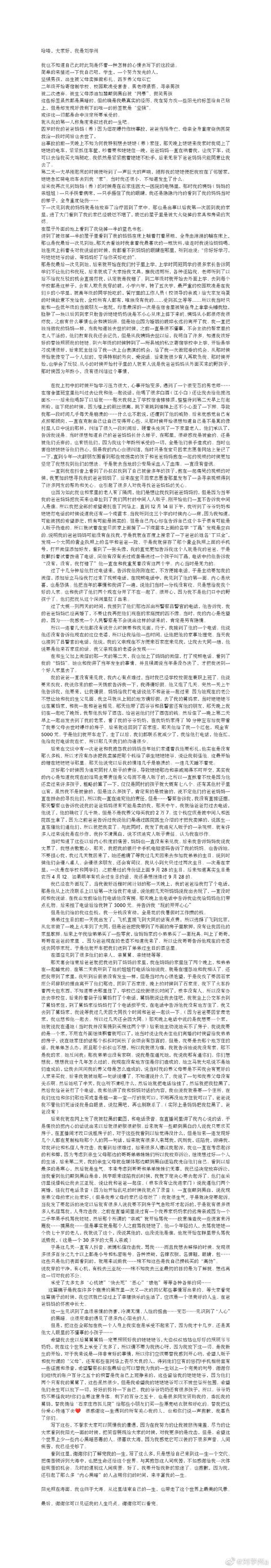 文中,刘学州还详细介绍了认亲过程及和亲生父母的纷争。