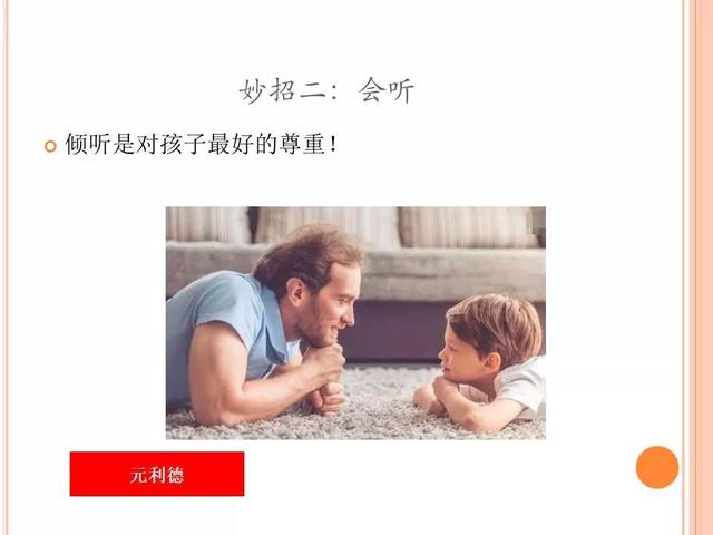 倾听是对孩子最好的尊重!不是一味的去说教,也要放下自己的身段,倾听孩子心声。不要只站在自己的角度,以自己经历和经验衡量孩子的对错,也要站在孩子的角度去思考问题;倾听的前提是要心平气和,不要急着驳回孩子的观点,要冷静听孩子说完;和孩子交流,可能免不了争执,但却可以克制情绪,不逞口舌之快,言语温和一些,尖锐的话语,既伤了孩子尊严和自信,也伤害亲子关系。