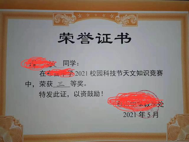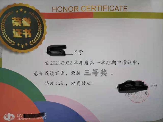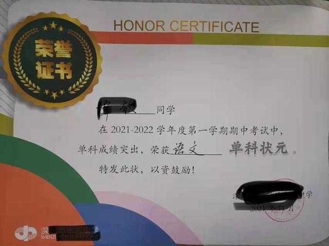 他的总分得到学校三等奖。他的语文是学校的单科状元。他还得到了2020-2021学校的年度的奖学金。