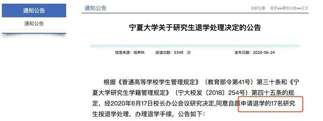 6月24日,宁夏发布通知,同意自愿申请退学的17名研究生按退学处理