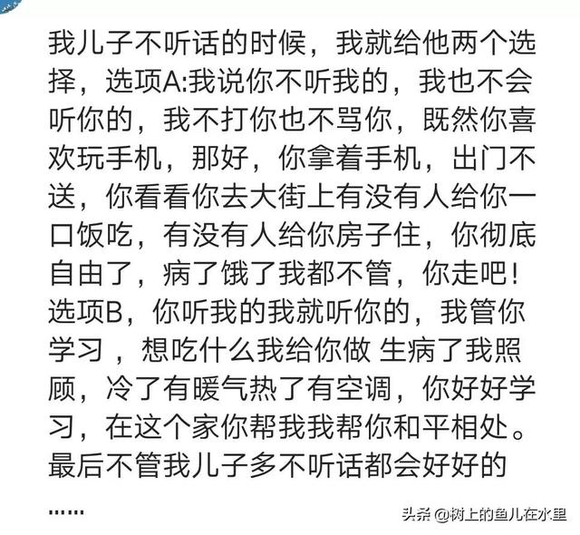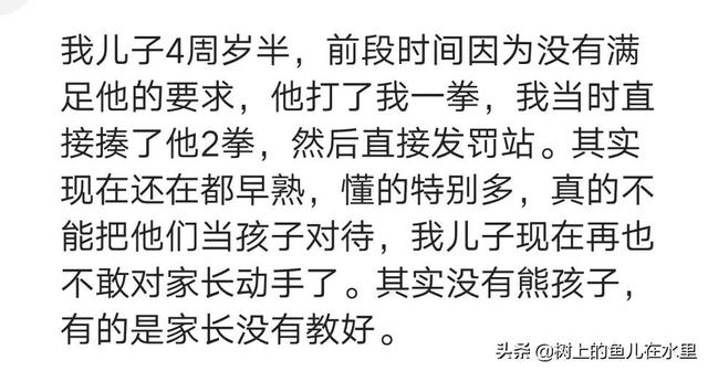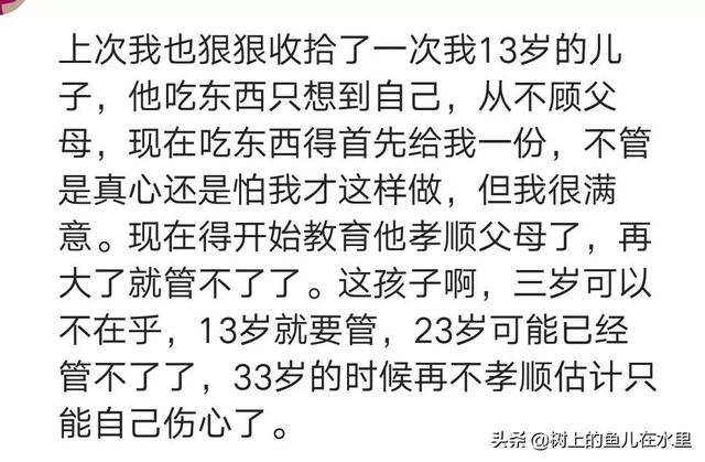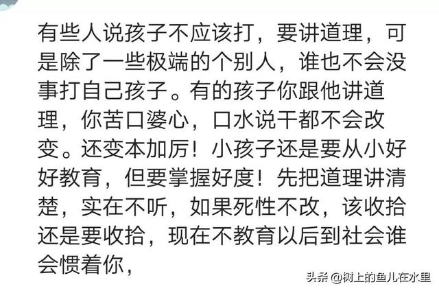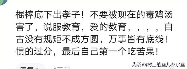 网友一:孩子要管,小树要砍。孩子的坏毛病养大了,就跟小树的歪树杈一样长粗了,不下狠心砍去,只会让树越来越歪。打也是有学问的。打的目的是沟通,是让他反思自己的行为。让他知道底线,知道为人子女要尊敬父母,不能无原则地索取。
