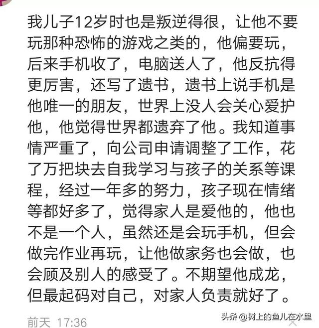 网友二:我儿子今年也是14岁,叛逆得不行。我发现他在其他人面前都很正常!知道克制情绪,知道礼貌,知道文明。在爸爸面前也还算克制,但在我面前简直说不得一句,提一下成绩,批评一句,他就马上炸了,又吼又哭,丢东西,踢凳子。说来说去妈妈最好欺负,最嫌弃妈妈。算了算了,放弃了,幸好我还有小儿子。